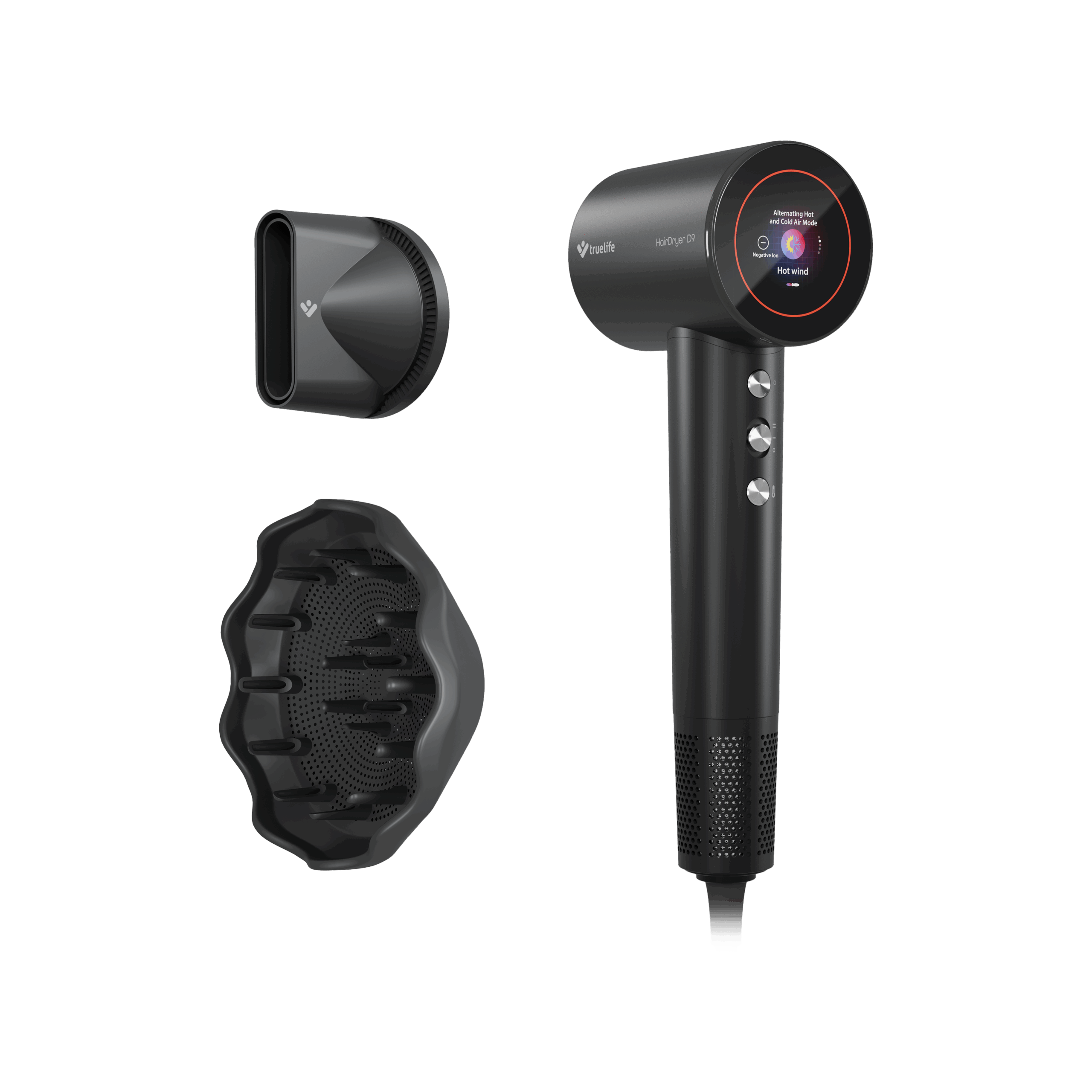 A prémium kategóriás TrueLife HairDryer D9 hajszárító a hatékonyságot, az intelligens funkciókat és a modern dizájnt hivatott egyesíteni. Az UltraFlow technológiás motor percenként képes 110 000 fordulatszámon működni, így erős légáramot kínál a gyors szárításhoz. Akár 200 millió negatív iont bocsát ki, segítve a haj statikus töltésének csökkentését és a természetes fény megőrzését. A 2 sebességfokozat és a 3 hőmérséklet mellett 5 üzemmód közül lehet választani. A választható módok között szerepel az állandó hőmérséklet, a változó hőmérséklet, valamint a kifejezetten hosszú hajra, rövid hajra és gyermekekre tervezett szárítási lehetőség. A futurisztikus LED kijelző mutatja a kiválasztott módot, sebességet és az ionizációs állapotot. A sokoldalú használatot a mágneses kiegészítők biztosítják.